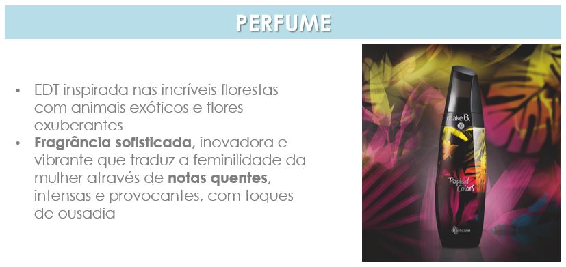 A Make B. Tropical Colors é a mais recente colecção do O Boticário, inspirada nas incríveis florestas, com animais exóticos e flores exuberantes. Esta colecção traz-nos cores imensamente vibrantes, uma mistura de tons terrosos e ácidos, e uma fragrância exclusiva que segue a tendência olfactiva mundial desta estação, naturalmente sofisticada e feminina, com notas quentes e provocantes.